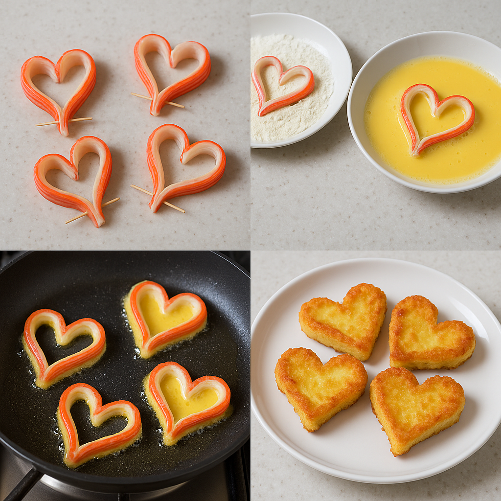 ① 하트 맛살을 밀가루에 먼저 묻히고, 달걀물에 푹 담가 코팅합니다.